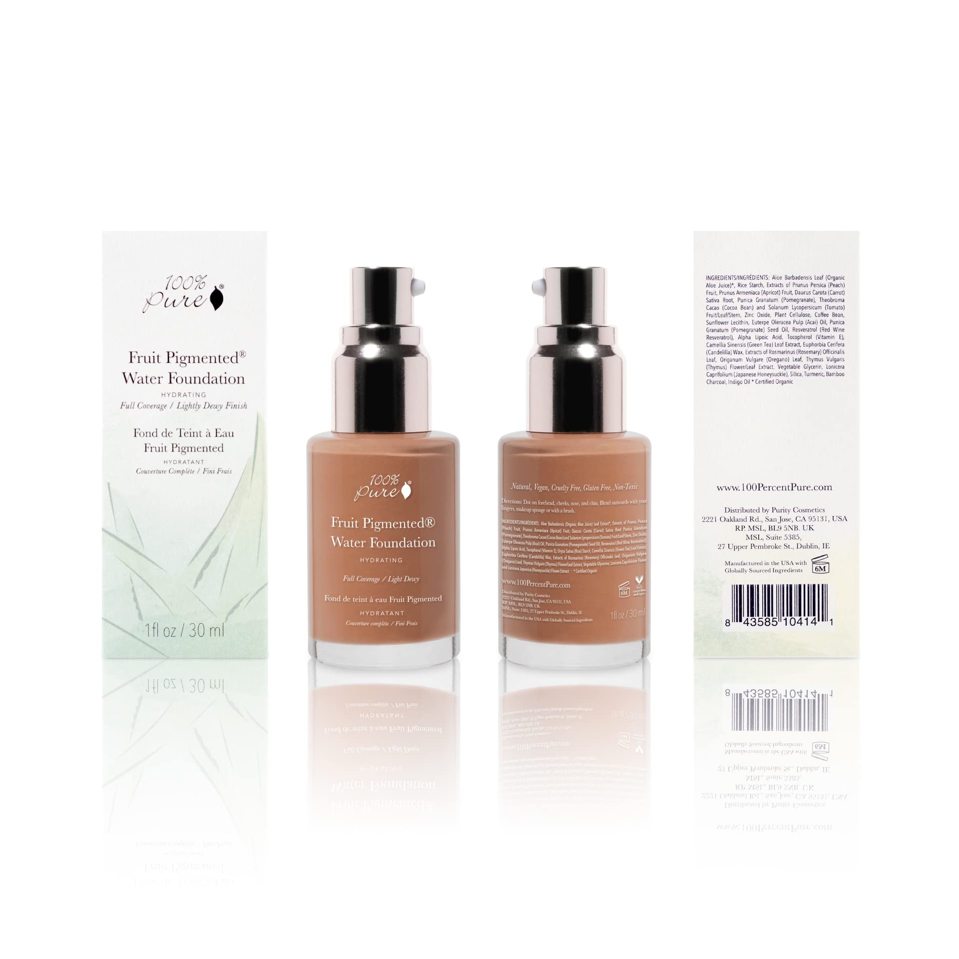 100% PURE Water Foundation Full Coverage Hydrating Makeup, Light Dewy Finish, Moisturizing Concealer for Normal to Dry Skin, Fruit Pigment Color Warm 6.0 w/Peachy Undertones for Tan Skin - 1 Fl Oz