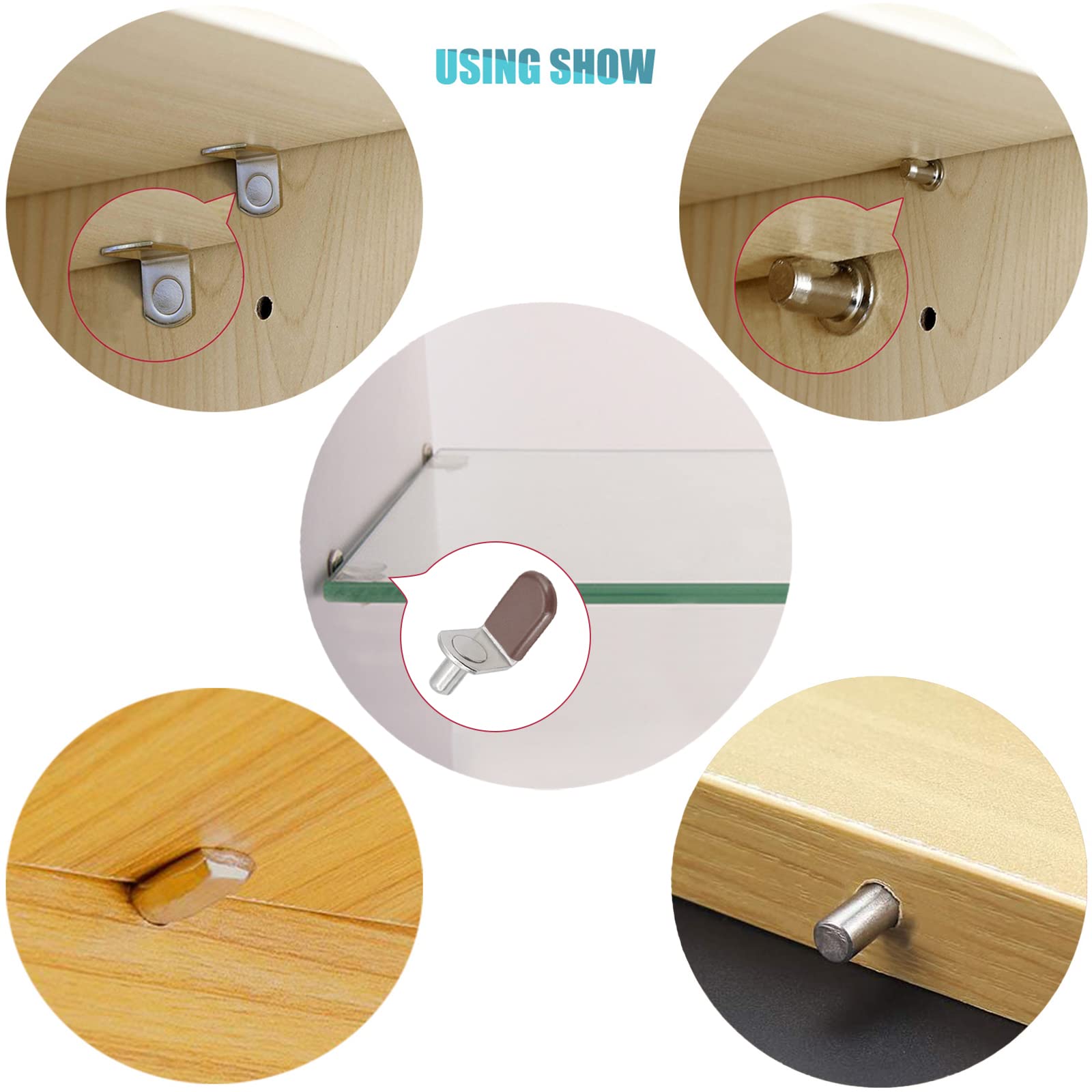* "L" shaped design engages the side of the shelf, forcing the pins to remain in the holes. Small hole allows the use of a screw to permanently secure the shelf.The unique design keeps the pin firmly seated in the cabinet holes, eliminating the chance of tear-out."L" shaped shelf pegs also is equipped with rubber cover,which can effectively prevent scratches and abnormal noises when it is used with glass and wooden shelves.