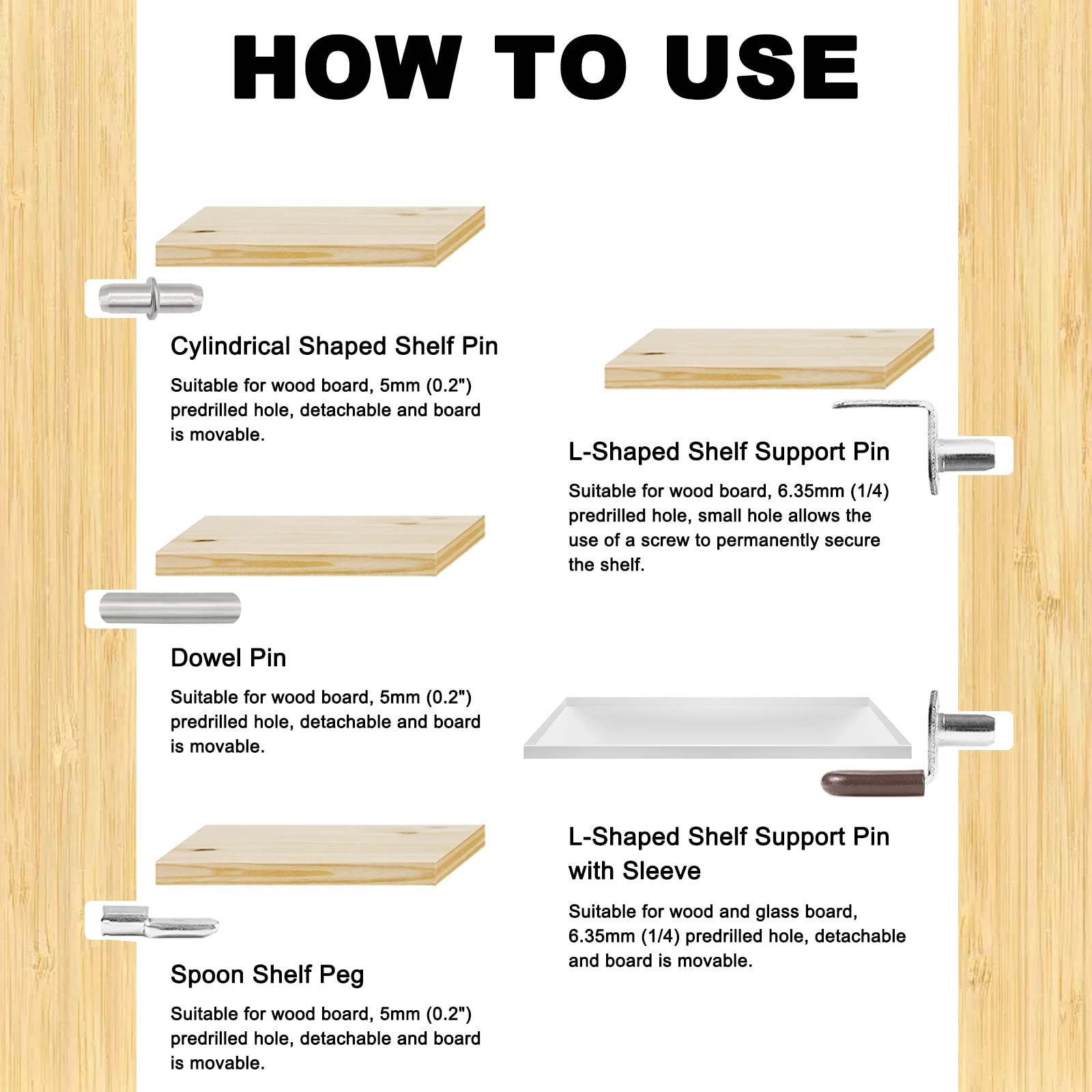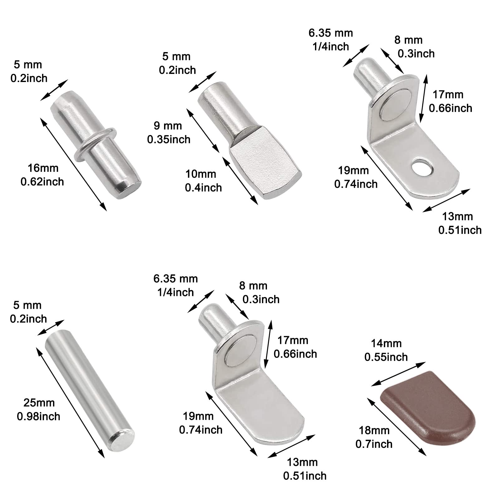 - 【Size Detail】Shelf support pegs can fits all cabinets with 5mm and 1/4 Inch holes.L-shaped bracket style shelf support(with hole and without hole)size: 6.35 mm/ 1/4 inch in diameter,pin length is 8 mm/ 0.30 inch,13 mm/ 0.51" in width; Flat spoon shelf holders pegs size:5 mm/0.20" in diameter,pin length is 9 mm/ 0.35 inch;Cylindrical shaped shelf pins size:5 mm/0.20" in diameter,pin length is 7.5 mm/ 0.3 inch;Dowel pins size: 5 mm/0.20" in diameter and 25mm/0.98" in length.