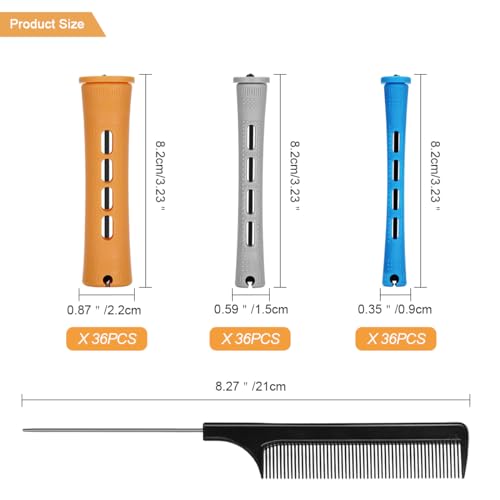 - ¡¼What You Get¡½You will get 108 pieces of hair perm rods in 3 different colors and sizes, 36 pieces of each color and size, a steel tail comb and a PVC storage bag, can meet your different needs, you can share with your family and friends as well.