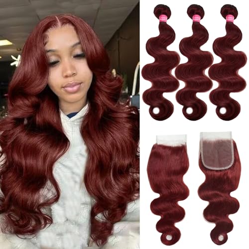 - 1.Body Wave Bundles With Closure Human Hair: Made of 10A Grade 100% Unprocessed Brazilian Virgin Remy Body Wave Bundles Human Hair, Cut From Young Girls Donors Directly. The Reddish Brown Body Wave Bundles Human Hair with Closure Offer a Signature Wavy Texture Full of Volume, Bounce and Style. Can Be Dyed or Bleached, Straightened Or Held Wavy to Your Liking.
