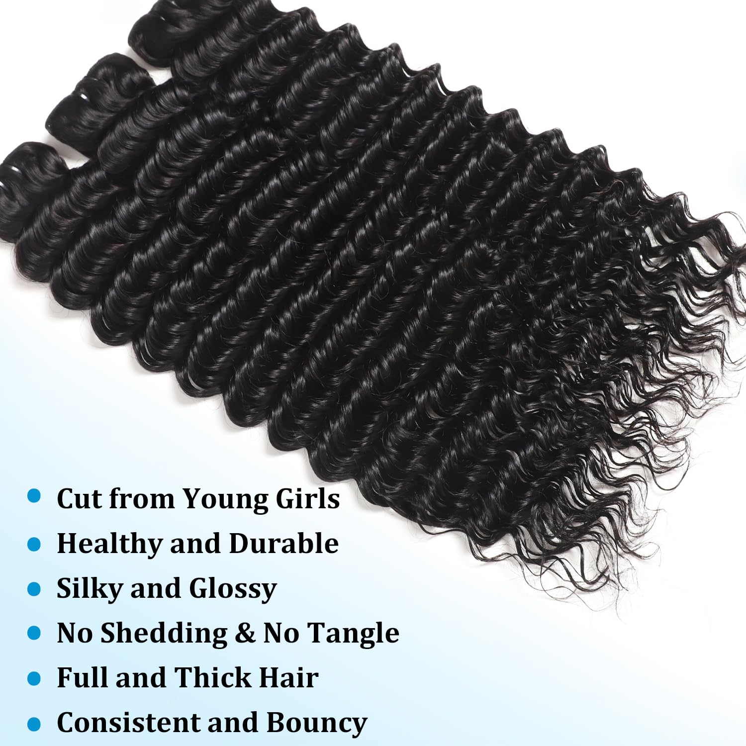 - Deep Wave Human Hair Bundles Material: 100% Unprocessed Virgin Human Hair Bundles, All The Hair Is Cut From Young Girls Directly, Soft and Bouncy, High Quality, Beautiful Wet and Wavy Bundles, High Elasticity and Good Curls.