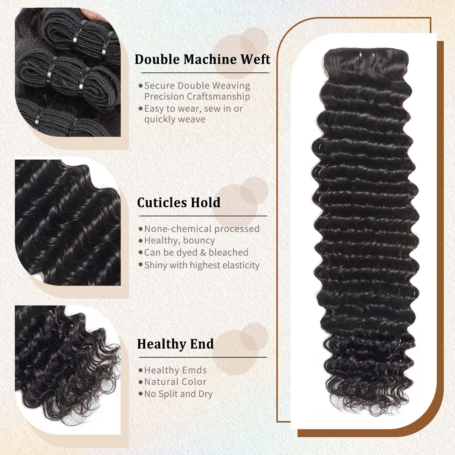 - Human Hair Bundles Material:100% Unprocessed Brazilian Virgin Human Hair Bundles Deep Wave Human Hair Bundles,Cut directly from the young girls,Soft and elastic, Healthy and Durable,Smooth and Comfortable