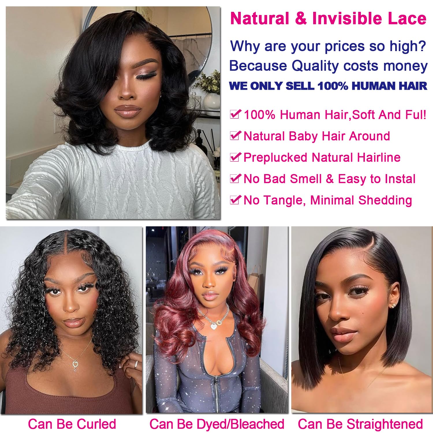 - 【Bob Wig Lace Size】13x6 HD Transparent Swiss Lace, Soft and Breathable, Blends Perfectly into Your Skin, Large Lace Size Can do Middle Part, Side Part, and Can do High Ponytail& Bun, Styled as You Like.