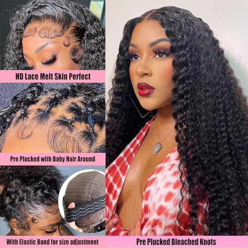 13x6 Deep Wave Lace Front Wigs Human Hair 200 Density HD Lace Front Wigs Human Hair Pre Plucked Bleached Knots Glueless Wigs Human Hair Wet and Wavy for Women (Natural Black 13X6, 20 inch, Curly)