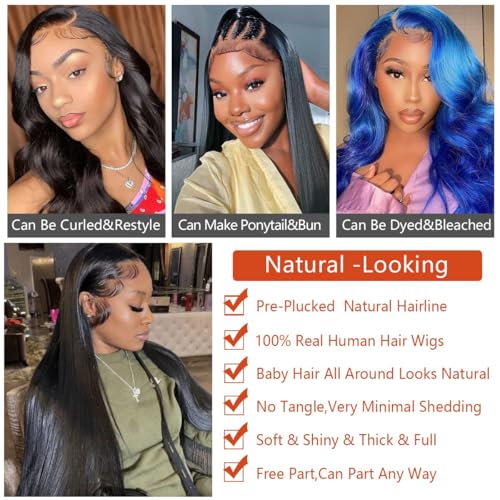 - Straight Lace Front Wigs Human Hair Pre Plucked: straight wigs for black women, full volume makes it thick and even, no split ends. Ear to ear natural hairline 13x6 swiss transparent lace match all type skin colors and look more natural. 100% human hair wigs, true to length, without tangle or shedding.