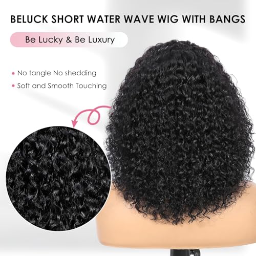 15A Raw Human Hair Wig with Bangs 4x2 Lace Short Water Wave Curly Glueless Wigs Layered Bob Wig Human Hair 180% Density Ready to Wear Wigs Glueless Human Hair for Women (14 Inch 1B Black)
