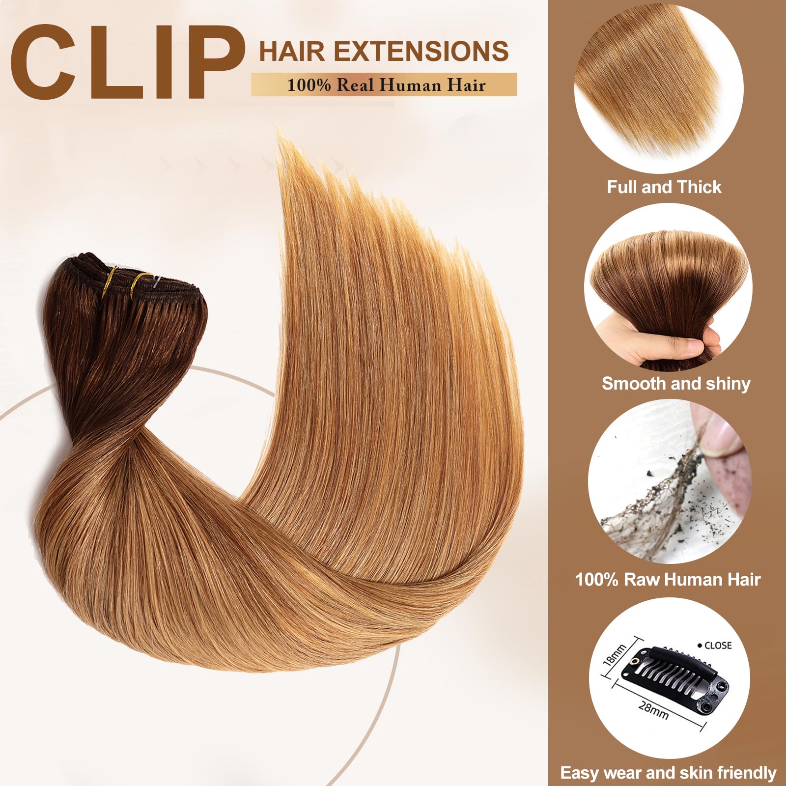 16A Premium Clip in Hair Extensions Real Human Hair, 18inch 120g 7pcs(Service life1.5~2 years)Remy Seamless Invisible Double Weft Human Hair, #T4/27 Balayage Multiple Washes Keep Texture Soft