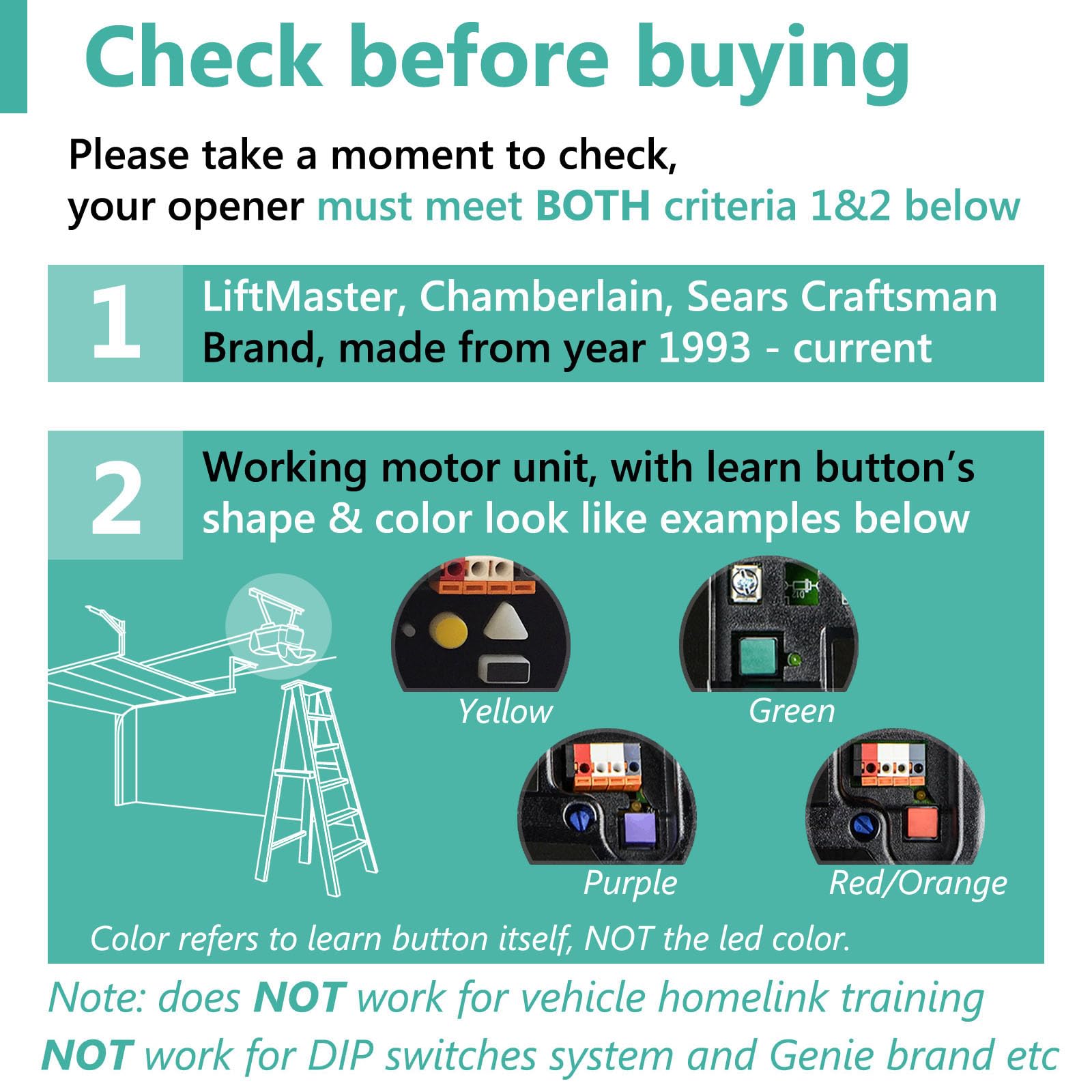 - ONLY works with 1993-current LiftMaster, Chamberlain, Sears Craftsman brand openers with Purple, Red/Orange, Yellow, Green smart/learn button on the powerhead (please check listing photos before purchase)