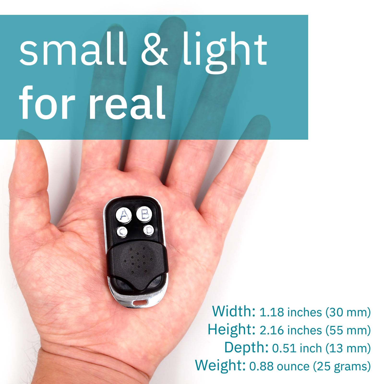 - Small, compact and lightweight keyfob style easy to carry around. Easy to follow programming instructions and CR2032 battery pre-installed.