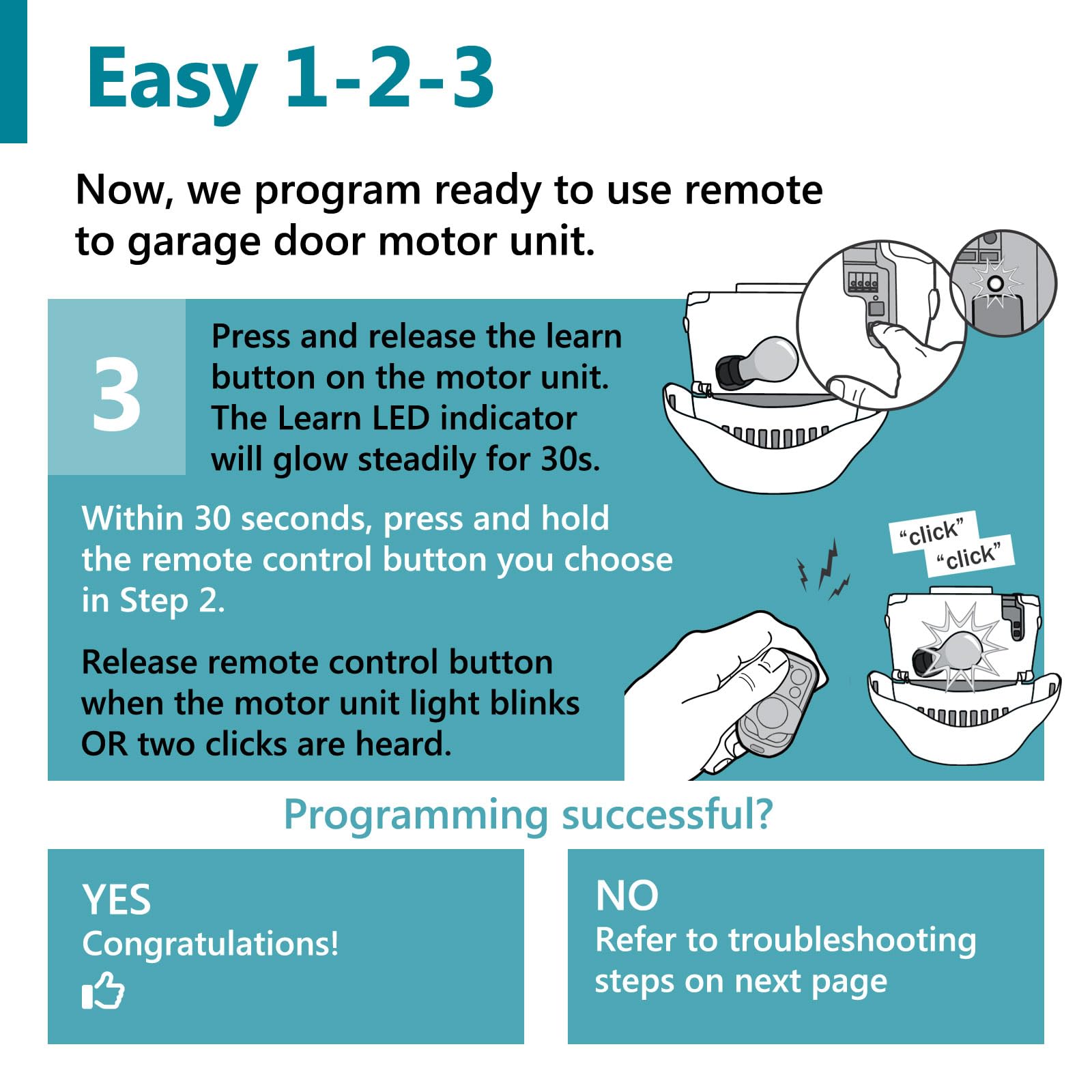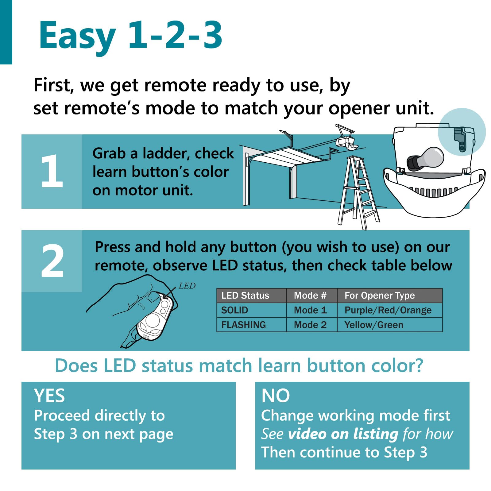 PLEASE NOTE: The default mode of the remote is for Purple/Red/Orange Learn Button Opener, you will need to change the mode of the remote if you are using a Yellow/Green Learn Button Opener (See video or manual - switch working mode)