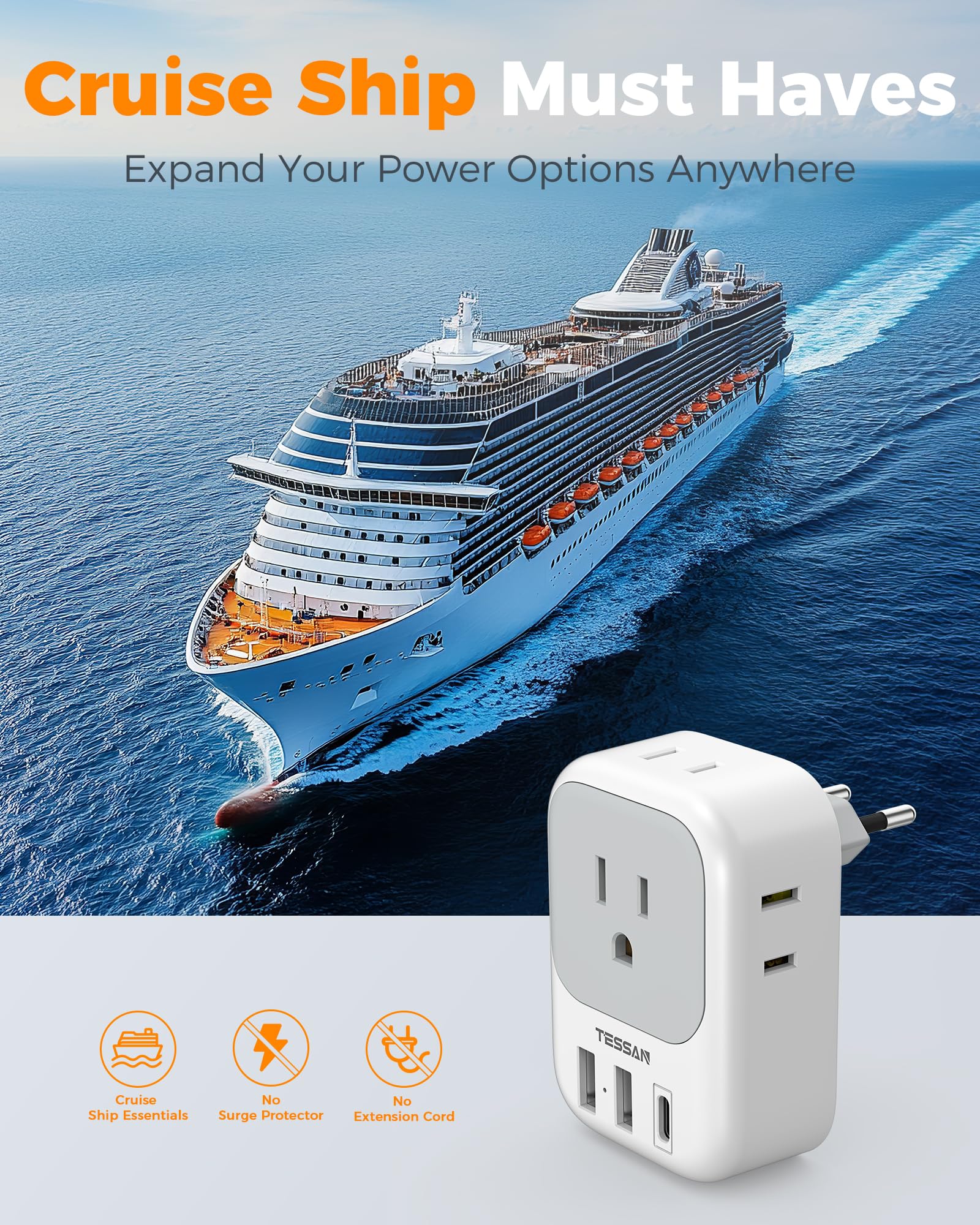 - Compact and Portable: Compact size 2.24 × 3.14 × 2.65 in and lightweight 3.48 ounces; International power adapter fits easily into your bag; EU adapter with 4 sided design won't block when plug in large adapter; No surge protection, cruise ship essentials