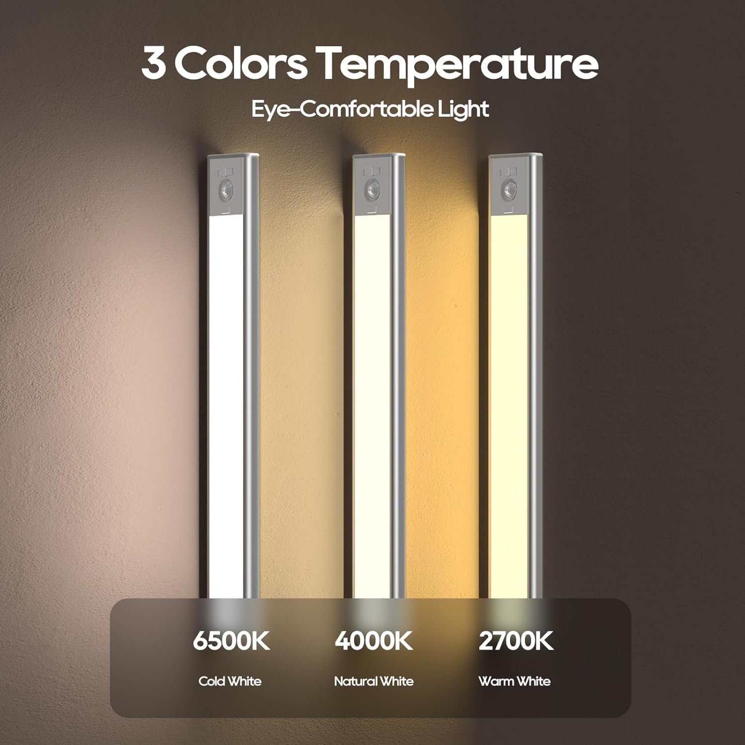 - 【3 Color Temperature】Under cabinet lights is equipped with 62 LED lamp beads, side-illuminated, with a brightness of up to 160 lumens. The light is bright, soft and gradual, giving the human eye a short buffer time, effectively protecting both eyes from strong light. Short press to switch between three color temperatures, long press to adjust brightness by 10% -100%.