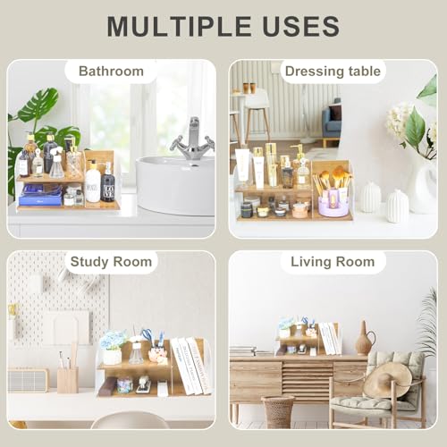 - Versatile Use: Perfect for the bedroom, living room, or kitchen, this bamboo organizer offers a practical and stylish storage solution. As a countertop organizer, it effectively saves space, making your skincare and makeup routines more convenient while creating a neat, bright, and naturally comfortable atmosphere.