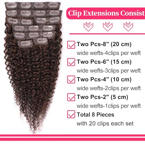 - ¡¼Chocolate Brown Kinky Curly Clip ins Details¡½£ºEach Set of Clip In Extensions Includes 8 Pieces/20 Clips, Weighing 110 Grams Per Set.The Color of the Clips Easily Blends with Your Own Hair. They Naturally Increase Hair Length and Volume Without Drawing Attention,The Clip-in Design Allows for Quick and Seamless Attachment to Your Own Hair, Ensuring a Tight Fit That Stays Naturally Smooth Even During Movement.