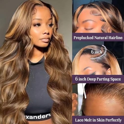 - Honey blonde highlights Wig Human Hair Advantages: 13x6 Lace Front wigs human hair, 4/29 HD lace front wigs with pre plucked natural hairline, bleached knots for a more natural and healthy appearance, comfortable fit, true to length, and gentle against the skin.