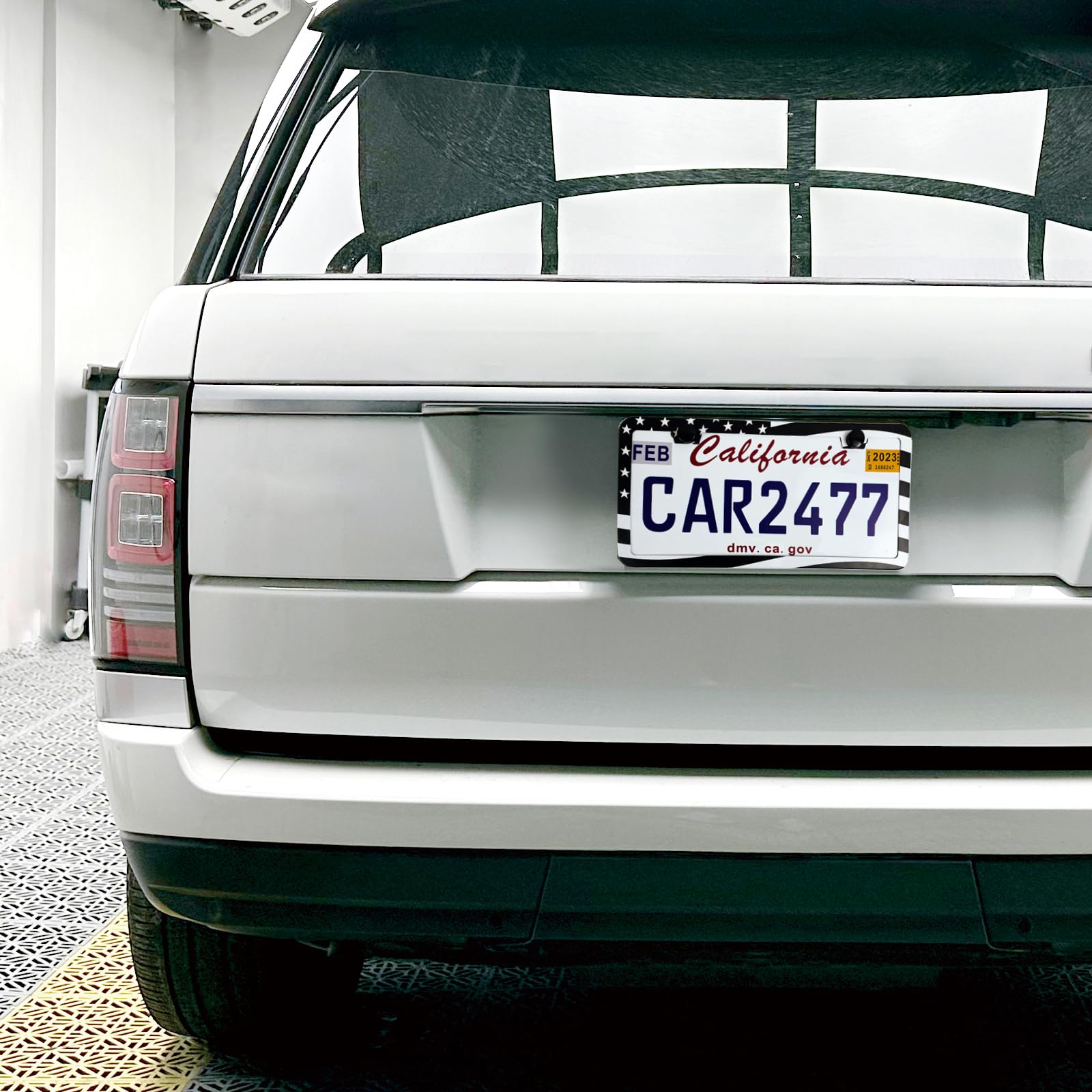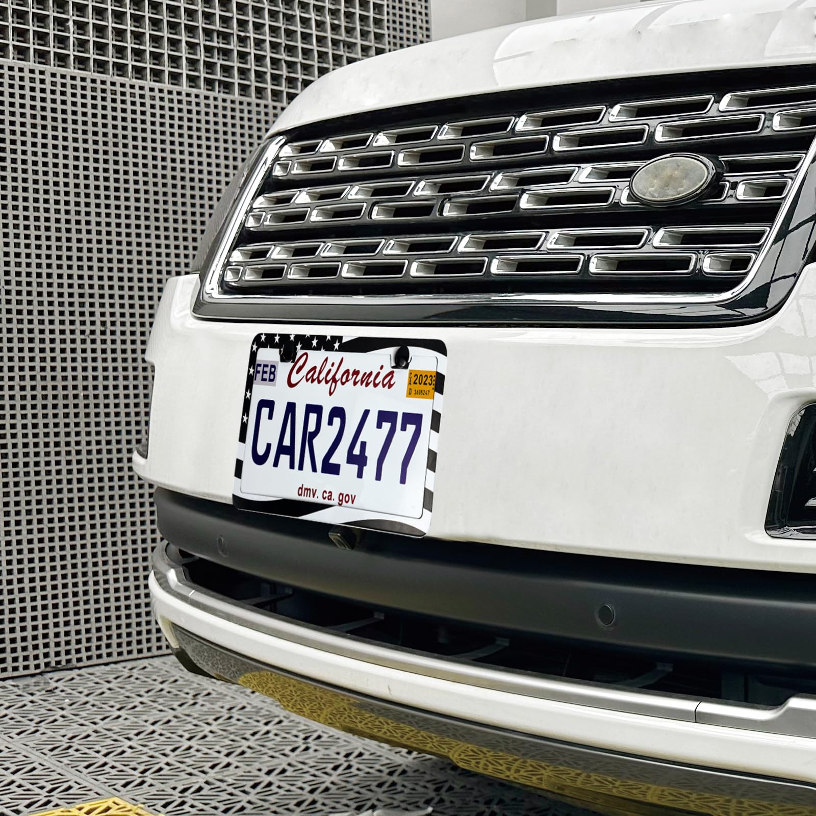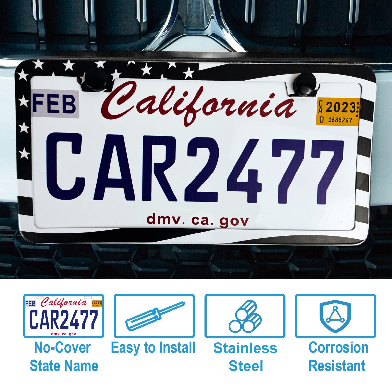 - No-Cover State Name: Upgraded 2-hole black American flag license plate frames size 12.25IN X 6.25IN fits all standard size U.S. license plates, can protects the front and rear plates of the car. The narrow border of the license plate frame does not block the status label or override the state name of your plate