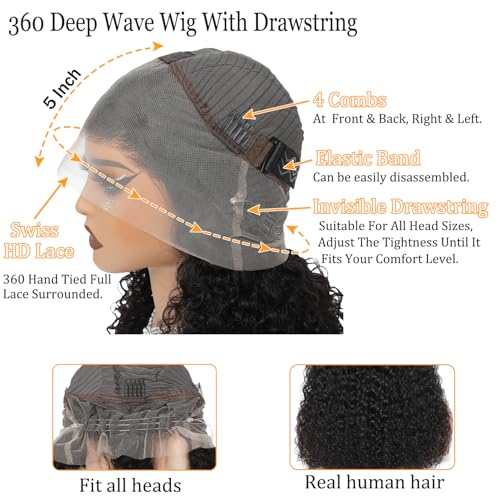- ¡¼360 Lace Front Wigs Human Hair With Drawstring Material¡½:New Upgraded 360 Full Lace Front Wigs Human Hair With Hidden Strap, 100% Unprocessed Deep Wave Front Wigs Huamn Hair Pre Plucked, Cut From Young Donor Directly, Soft And Natural, Healthy And Lasting Durability