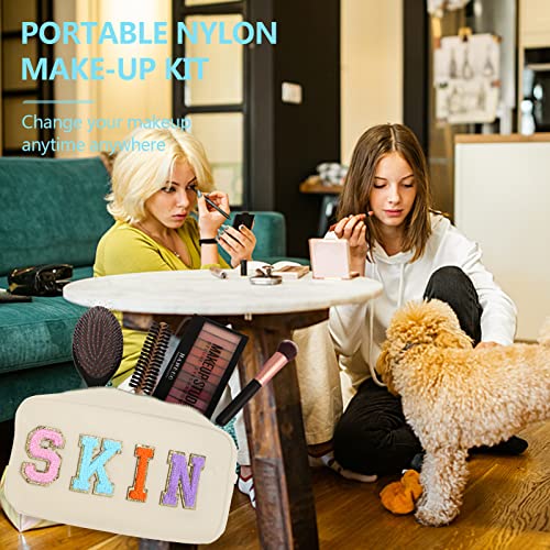 4PCS Nylon Zipper Waterproof Preppy Makeup Organizer Bag Set - Cosmetic Stuff Pouch for Women Travel Toiletry Organization Outdoor with Chenille Letter Patches