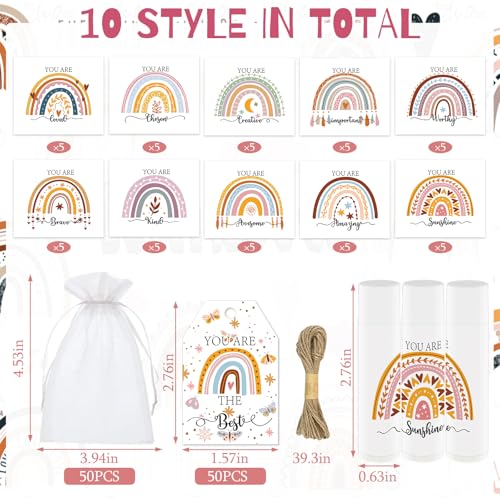 - ¢¾ [Creative Design] : This vanilla flavor Bohemian Rainbow gift lip balm bulk have 50 lip balm,10 different patterns and texts. It's beautifully designed with delicate patterns. Our card labels also uses the Inspirational discourse ,Them suitable for Put in organza gift bags,This is a perfect inspirational,make people happy gift.