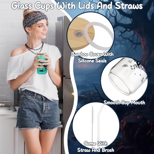 - Halloween Glass Cup: The pack includes 1 glass cup 16oz, 1 bamboo lid, 1 glass straw and 1 cleaning brush. 16 oz large capacity, enough for one taste; Suitable for coffee, latte, cold brew, smoothies, tea, milk shake, juice, cola, beer. Steep yourself in the unseen world of spirits as our wizard designs lend charm to your drinking experience