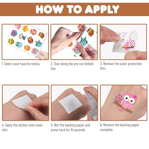 - ??¡¼PERFECT OWL TEMPORARY TATTOOS¡½: Our Owl-themed temporary tattoo stickers come with 8 pre-cut sheets, featuring 96 unique and adorable designs. Each sheet measures 6.3 x 4.7 inches, perfectly sized for kids. Thanks to the pre-cut perforated lines, you can easily tear them apart by hand?no scissors needed! These tattoos make fantastic party favors or small holiday gifts.