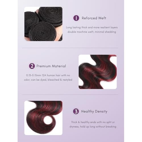 - Double Weft: The F1B/ bugundy highlight body wave 3 bundles adopt the advanced double-weft sewing technology which is tight, neat and thick, the strong double machine weft results minimal shedding and a longer lifespan.