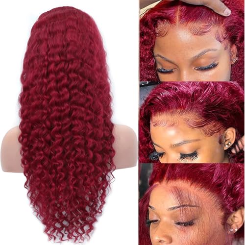 99j Burgundy Lace Front Wigs Human Hair 13x4 Water Wave Lace Front Wigs Pre Plucked 180 Density Red Colored Wigs for Black Women Curly Lace Frontal Wigs with Baby Hair 22 Inch