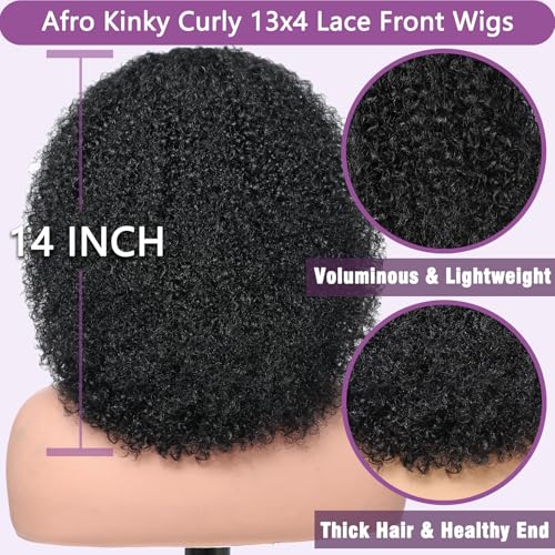Afro Kinkycurly Wig Human Hair, 13x4 Lace Front Glueless Bob Wigs, 180 Density Pre Plucked Transparent Lace Frontal, Brazilian Kinky Straight Wig for Black Women, Natural Black 14 Inch
