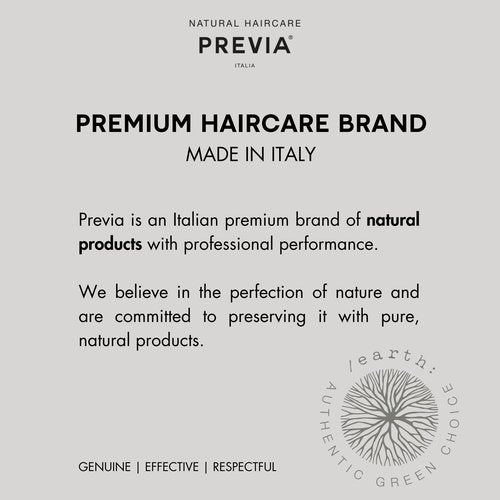 - Products, in line with Previa's ethic and sustainable philosophy, boast a percentage of certified natural active ingredients which ranges from 82 to 99,2%, and do not contain silicon, parabens, slack wax, mineral oils, aggressive surfactants, colors or animal-derived ingredients.