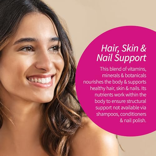 - HAIR & NAIL SUPPORT - This blend of vitamins, minerals & botanicals nourishes the body & supports healthy hair, skin & nails. Its nutrients work within the body to ensure structural support not available via shampoos, conditioners & nail polish.