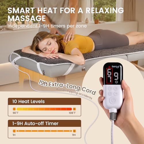 - Zoned Design, Precise Temperature Control: Dual-zone heating layout with 10 adjustable temperature levels to cater to personalized warmth needs for different body areas (e.g. back/legs), 1-9 hours timer enhancing massage comfort.
