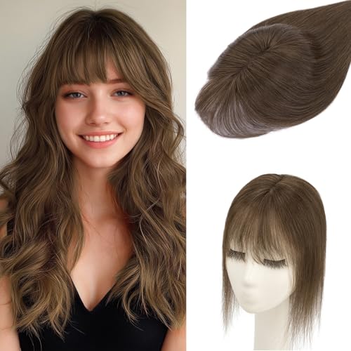 Benehair Hair Toppers for Women Real Human Hair 360¡Æ3D Clip in Bangs Toppers with Bang for Thinning 150% Density Hairpieces Lace Base Long Coverage Wiglet for Daily Use #02 Dark Brown 8Inch