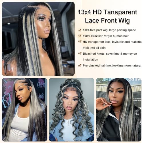 - ¡¼Silver Grey Highlights 13x4 HD Transparent Lace Front Wigs¡½13x4 lace front wigs human hair, ear to ear parting and 4 inch deep parting lace space, pre plucked bleached knots with baby hair around and natural hairline, realistic and natural looking. Large parting space can do middle part, side part, any part you prefer, and can make highly ponytail & buns, multiple choice. HD lace is soft, breathable and invisible, melt into more easily, suitable for most skins.