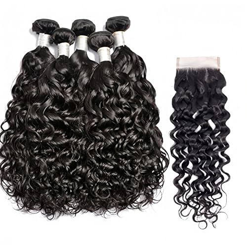 Brazilian Water Wave 5Bundles(50g/bundle) with 4x4 Lace Closure Wet and Wavy Bundles with Closure Deep Curly Bundles Human Hair Bundles with Closure (16/16/16/16/16+16)