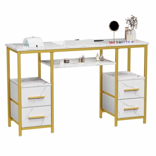 - Elegant Marble Finish & Acetone-Resistant Surface: Featuring a white faux marble-inspired top, gold-toned frame, and metal drawer handles, this nail desk with storage blends modern elegance with salon-ready practicality. The acetone-resistant surface helps guard against damage from nail polish remover and salon chemicals, ensuring lasting beauty and performance