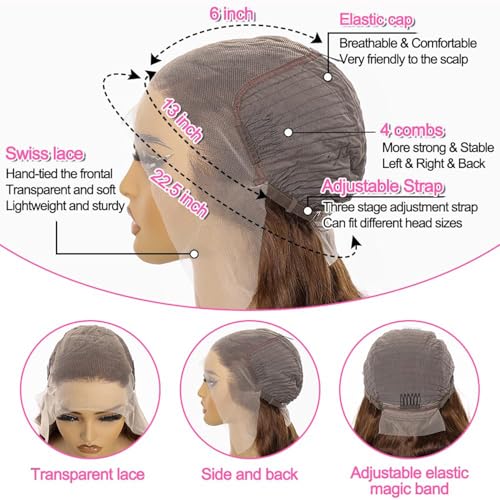 - 13x6 chocolate Brown Wig Human Hair Quality: 13x6 lace front wigs human hair, baby hair around, advanced hand-tied workmanship avoid shedding, soft and thinner, comfortable and breathable, super small bleached knots to make natural look, hand-crafted technology