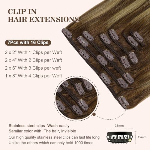 Clip in Hair Extensions Real Human Hair 120g 7pcs Human Hair Clip in Extensions 16 Inch Chocolate Brown Mixed Caramel Blonde #4/27/4 Thickened Straight Real Hair Extensions Clip in Human Hair