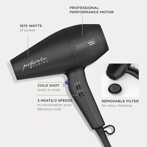 Details: Elevate your hair game with the InfinitiPRO by Conair® Performa Series Ionic Ceramic Dryer. Designed to deliver professional results, this hair dryer combines cutting-edge ionic and ceramic technologies to eliminate frizz by up to 75% (when compared to hair dryers with natural ion generation) and minimize heat damage. The durable and professional AC motor delivers up to 3x longer lifespan, drying hair faster (compared to Conair® DC motor hair dryer models). Customize the way you style with 3 heats and 2 speeds, then lock in your look with the cold shot button. Attachments include a concentrator for creating sleek styles, a diffuser for bringing out perfect curls, and a thermal pik for adding volume. With a convenient drawstring pouch, storage and travel are a breeze. Get ready for salon-quality results at home!