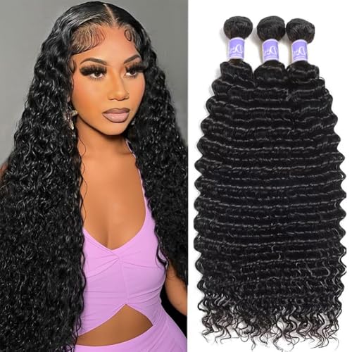 Deep Wave Human Hair Bundles 12A Brazilian Virgin Human Hair Bundles 18 20 22 Inch Wet and Wavy Curly Bundles Human Hair Extensions for Black Women Natural Black Color