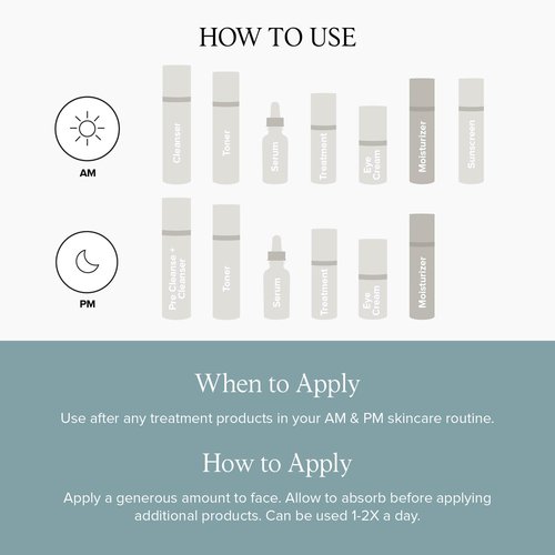 - How to Use: Apply a generous amount of facial moisturizer to the entire face as needed. Allow moisturizer to fully absorb before applying additional products. Can be used twice per day or as needed to hydrate the skin.