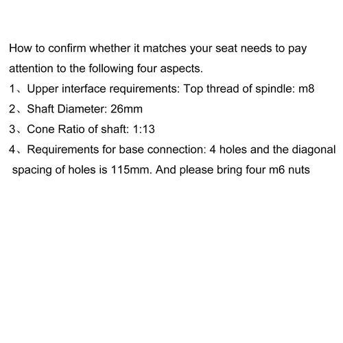 - Pls confirm whether it matches your seat: 1.Top thread of spindle: m8 2.Shaft Diameter: 26mm 3.Cone Ratio of shaft: 1:13 4.Requirements for base connection: 4 holes and the diagonal spacing of holes is 115mm.
