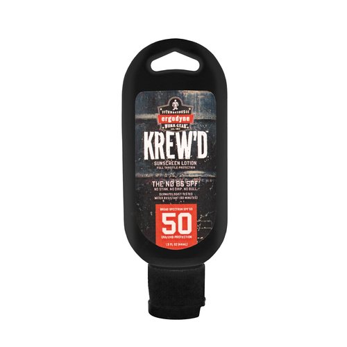 Details: The KREW’D® 6352 SPF 50 Sunscreen Lotion (1.5oz bottle) provides safe and effective broad-spectrum UVA/UVB protection against sunburn. It’s a water-resistant and sweat-resistant sunscreen for 80 minutes. This sunscreen comes in a 1.5oz squeeze bottle with a connection point for an optional hang cord or carabiner to attach to belt loops, backpacks, keys, etc. The 50 SPF offers protection against both UVA and UVB rays, which can cause skin cancer. KREW’D® is a water-resistant sport formula that provides even coverage for better protection. It's lightweight, non-greasy, absorbs quickly and is free of paraben/phthalates and octinoxate/oxybenzone. Slather. Work. Repeat. Skin damage can occur all year round from sun exposure. Sunblock should be applied evenly thoroughly on exposed skin. We recommend applying liberally 15 minutes before you go into the sun to allow the sunscreen to fully bind to the skin. Reapply every 2 hours, or as needed. Designed for people working outdoors in the direct sunlight including construction, agriculture, transportation, solar, roofing, landscaping/grounds. Also good for active outdoor recreational use like sports, hiking, gardening, etc.
