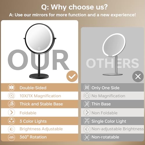 - Lighted Makeup Mirror with Magnification, with 1X and 10X magnifying, this mirror caters to a wide range of beauty and grooming needs. The 10X magnification is perfect for tasks that require precision, like tweezing or detailed makeup work. On the other hand, the 1X magnification is suitable for basic skincare routines and general makeup application
