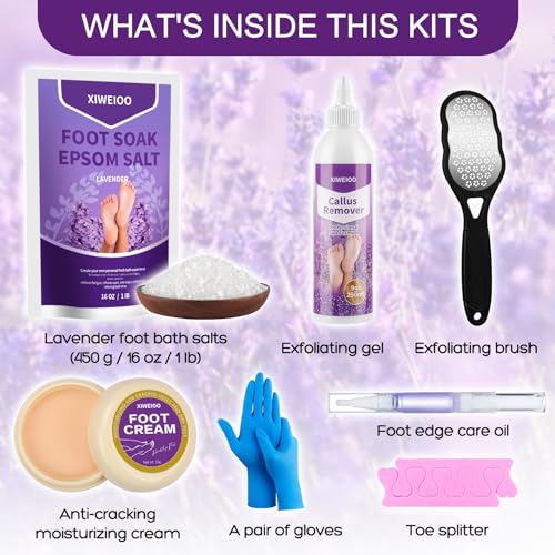 - ??XIWEIOO Lavender salt soak kit£º Lavender foot bath salts 1 IB, Anti-cracking foot cream 20g Exfoliating scrub 250ml 1 exfoliating brushA toenail treatment oil Two toes separate cotton pads One pair of professional foot bath gloves Lavender Foot Soak Body Detox Foot Soak for Dry Cracked Feet - Lavender Oil & Tea Tree Oil Foot Soaker ? Pedicure Supplies for Foot Spa Soak