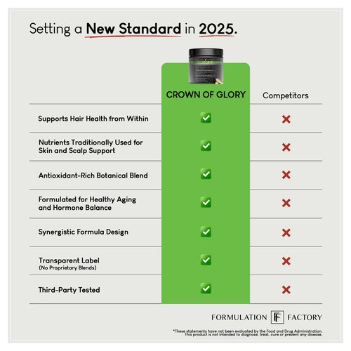 Formulation Factory Crown of Glory 10-in-1 Hair Growth Maximizer, DHT Blocker with Saw Palmetto, Fo-Ti, Collagen, Supports Thicker Hair & Scalp Health (2 Month Supply, 120 Capsules)