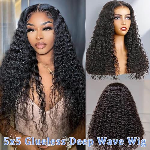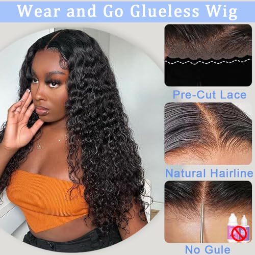 Glueless Wigs Human Hair Pre Cut 5x5 Lace Closure Deep Wave Wig 180% Density Wear and Go Human Hair Curly Wigs for Black Women Natural Black Color Small Head Friendly 26Inch