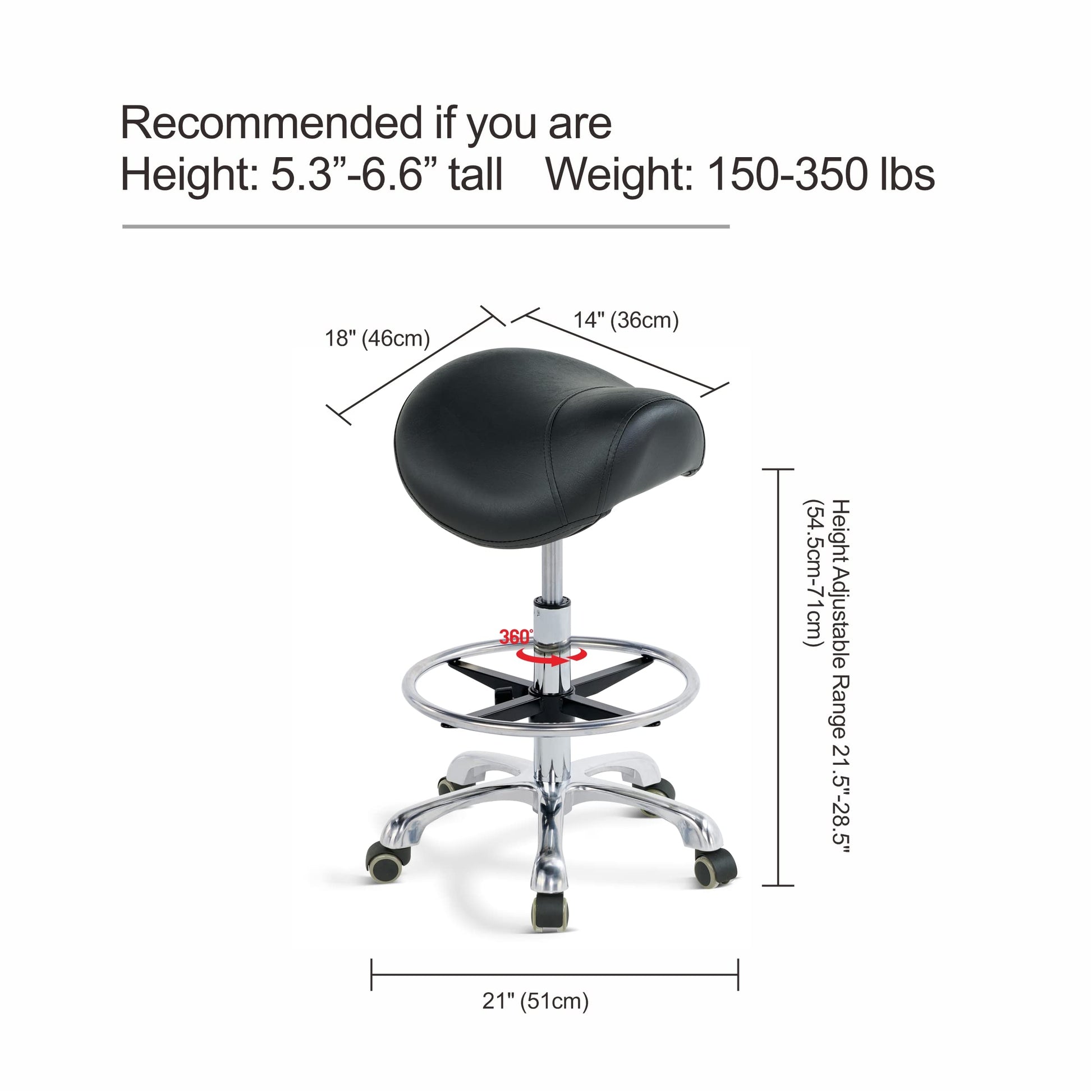 - Versatile and User-Friendly: The saddle stool's 360-degree swivel seat and adjustable height from 20-28 inches, paired with a smooth hydraulic lift, make it a seamless fit for diverse workspaces and personal preferences. The reinforced nylon casters provide a quiet, smooth glide across all floor types.