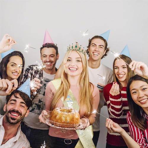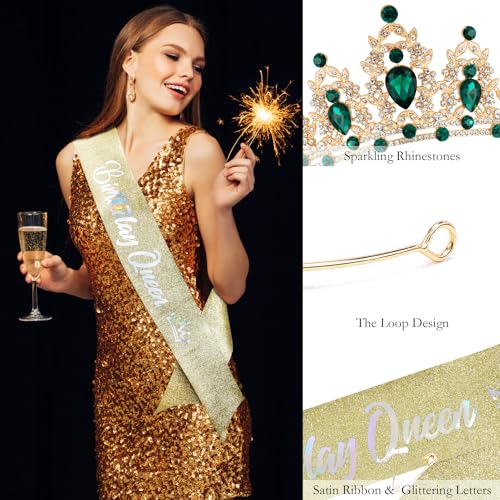 - ¡¼Birthday Queen Sash and Crown¡½The crystal green tiara is made of a sturdy metal, super solid and sturdy and can be worn for years. The little rhinestones on the crown shine brilliantly and the glitter & foil ¡°Birthday Queen¡± sash is shimmering nicely, and come with a safety pin to fasten the ends for the best fit.
