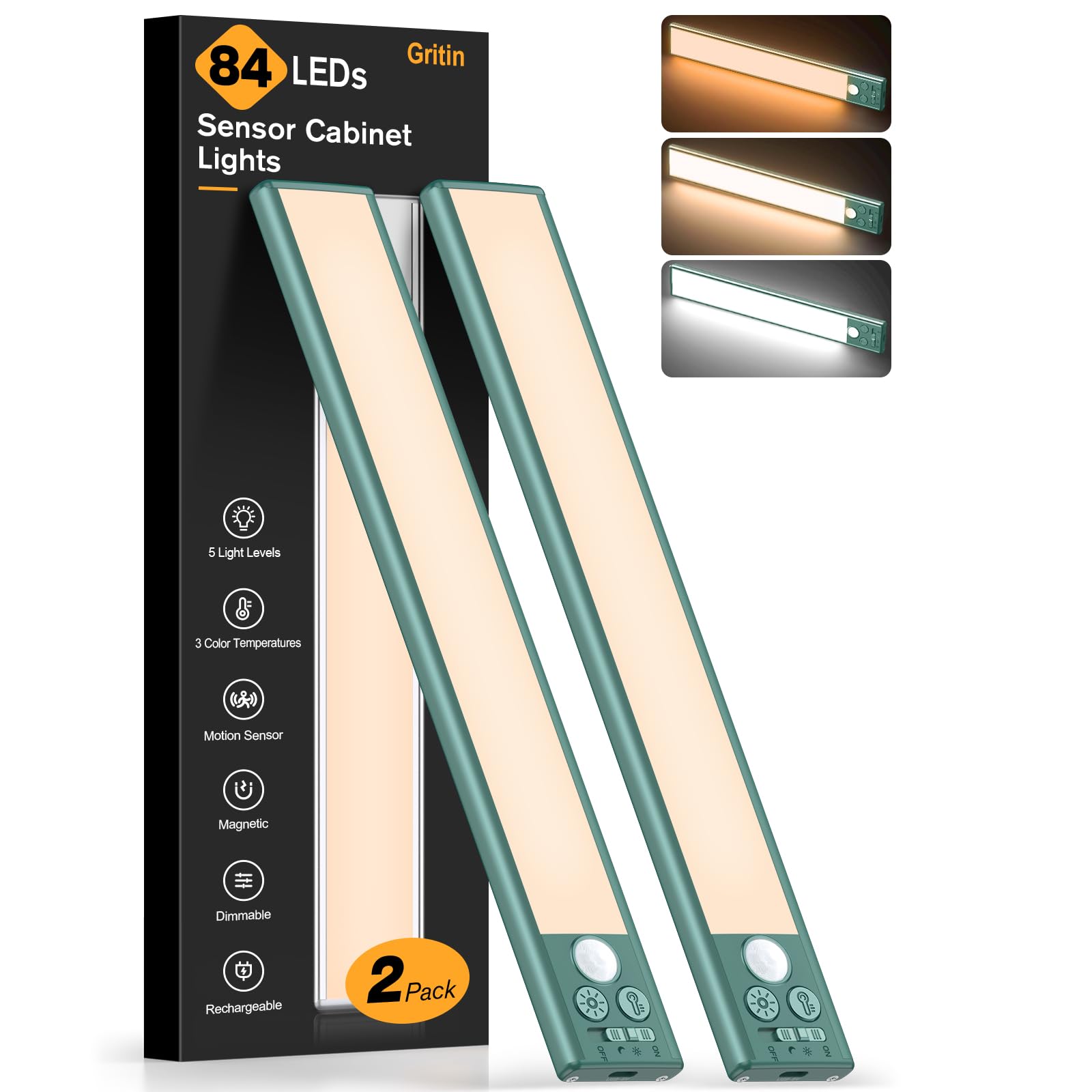 Details: Gritin 10.2inch Under Cabinet Lighting Rechargeable -84 LED Super Bright,3-Color& 5 Level Brightness,4 Modes,Motion Sensor,Long Lasting- Easy Installation Magnetic Under Cabinet Closet Lights -2 Pack